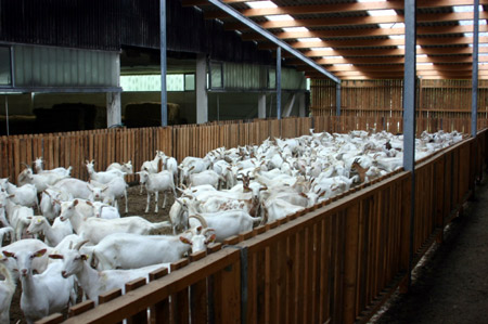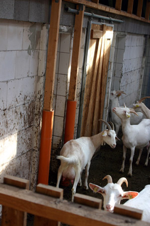 Melkstandzugang mit „Schrammschutz“ (Installation von Rohren über scharfkantige Ecken, um Hautabschürfungen bei hereindrängenden Ziegen zu vermeiden).